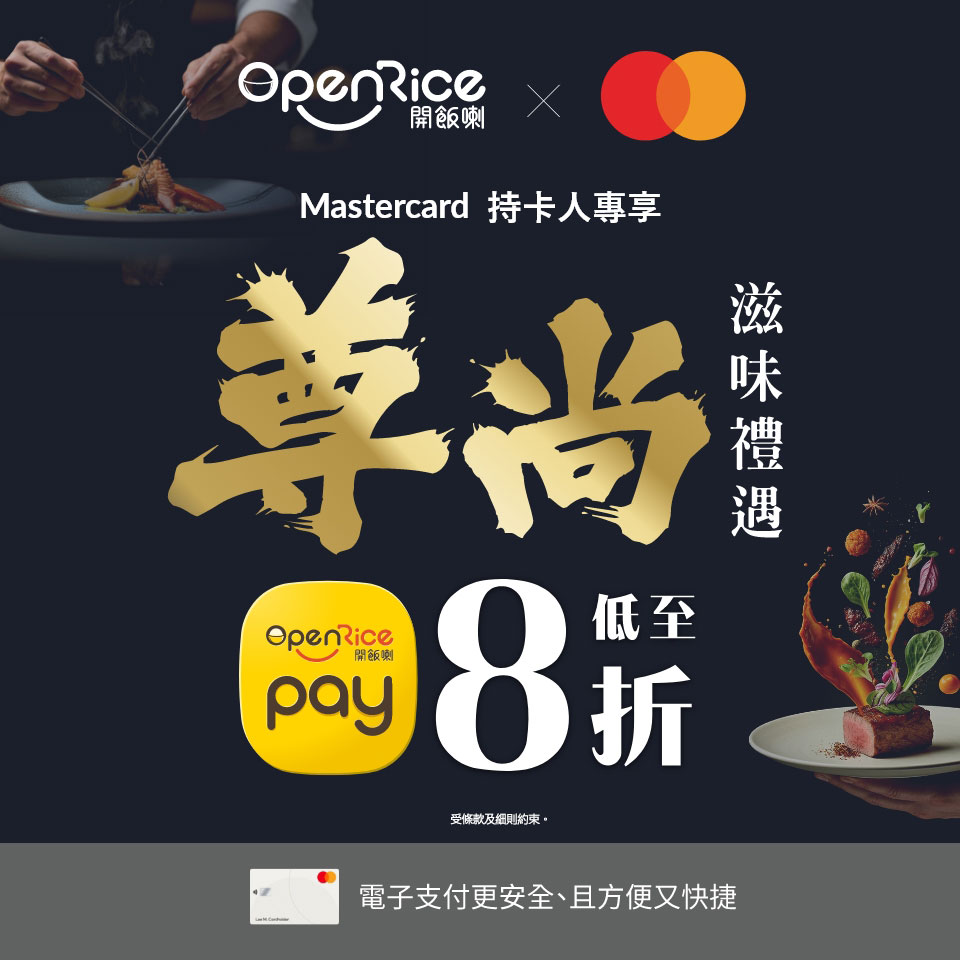 憑Mastercard購買餐飲券、外賣自取及經OpenRice Pay以自己手機拍實體卡付款可享每週優惠高達HK$180!優惠受條款及細則約束。