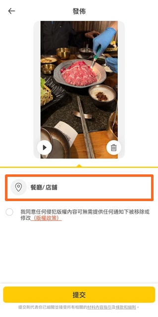 本公司致力建立及維持一個公平公正的網上飲食交流平台,凝聚愛吃愛分享的用戶,為維護本渠道對用戶的實用性,不被商業噪音、仇恨言論、仇恨言論或無用信息所充斥,你在提交餐廳影片時,也應遵守【餐廳食評及評論指引】,不應發布任何可能包含以下內容的材料: