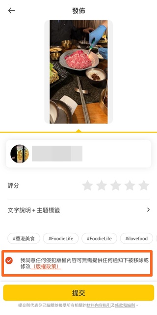 - 抄襲、盜用其他食評的內容、文章、或使用未經版權持有人允許的內容;