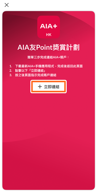 • 下載最新AIA+ 手機應用程式並設立帳戶,完成後回到此頁面並按「+ 立即連結」