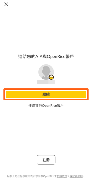 • 選擇哪一個OpenRice帳戶與AIA帳戶連結,及後按 「繼續」
