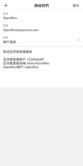 • 於類型選擇「帳戶查詢」後,提供你的OpenRice帳戶、「亞洲萬里通」帳戶號碼、登記人資料及輸入要求取消「亞洲萬里通」連結於查詢欄後按「提交」,我們會將7個工作天內處理你取消「亞洲萬里通」連結的要求(在處理有關要求期間有機會無法獲得里數及未能重新連結「亞洲萬里通」帳戶)