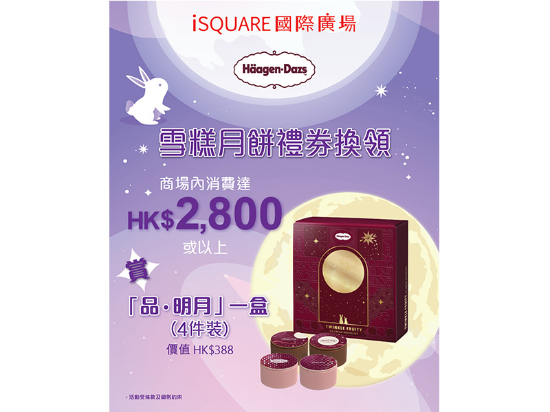 iSQUARE 國際廣場 消費即可換領「Häagen-Dazs™雪糕月餅」 中秋節將至,為增加節日氣氛,iSQUARE 國際廣場推出「Häagen-Dazs™雪糕月餅」換領活動,消費滿HK$2,800 即可換領「品‧明月」雪糕月餅一盒,清新果漾雪糕配香濃朱古力脆皮,一盒「品‧明月」雪糕月餅有4 件指定口味,包括︰士多啤梨 (2 件)、芒果(1 件)、藍莓(1件)。 顧客於換領期內蒞臨iSQUARE 國際廣場任何三間、四間或五間不同商戶,以電子貨幣同日累積消費達HK$2,800 或以上,即有機會換領Häagen-Dazs™雪糕月餅「品‧明月」乙盒 (4 件裝)。 換領日期 : 1 Aug 2025 至換完即止 換領時間 : 10:30 a.m. - 10:30