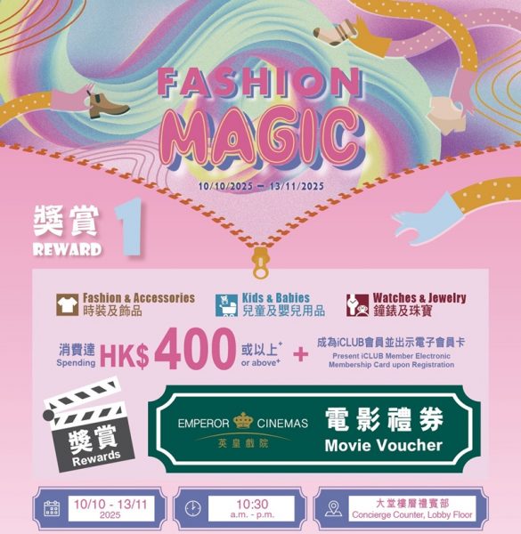 iSQUARE國際廣場 「Fashion Magic 2025」 消費換領【英皇戲院 電影禮券】 尊享商戶消費優惠;部份貨品低至2折 iCLUB會員換領【HK$100商場優惠券】 由即日起日至11月13日,iSQUARE國際廣場為你帶來多個精彩限定購物優惠,推出「Fashion Magic」獎賞活動! 奬賞1:「英皇戲院」電影禮券 於iSQUARE國際廣場指定商戶消費達HK$400或以上,即可獲得iSQUARE國際廣場「英皇戲院」電影禮券! 換領日期 : 10 Oct – 13 Nov 2025 換領時間 : 10:30 a.m. - 10:30 p.m. 換領地點 : iSQUARE